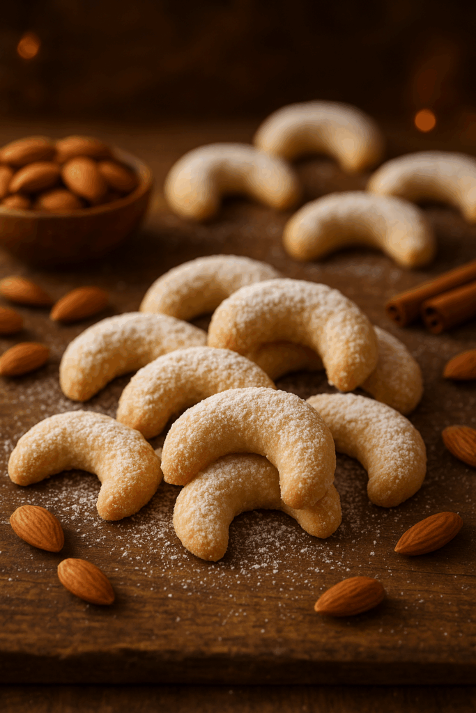 Die Kipferl noch warm vorsichtig mit Puder-Erythrit bestäuben – so bleibt der feine Belag haften und sorgt für den typischen Vanillekipferl-Look.