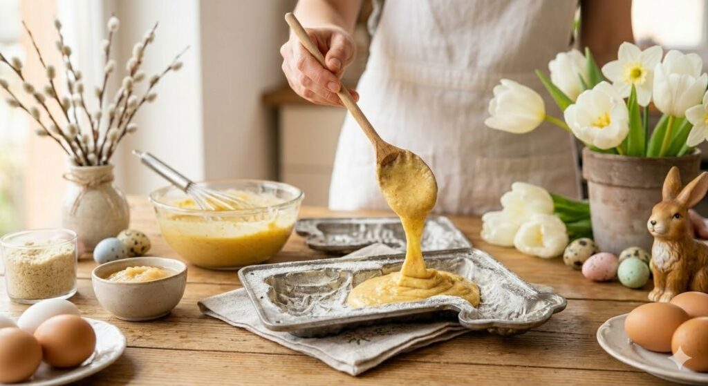 - Vorbereitung: Heize den Backofen auf 175°C Ober-/Unterhitze vor. Fette deine Osterlamm-Form sehr gründlich mit Butter oder Kokosöl ein und bestäube sie leicht mit Mehl oder gemahlenen Mandeln. Klopfe überschüssiges Mehl heraus. Das ist der wichtigste Schritt, damit das Lamm später unbeschadet aus der Form kommt!