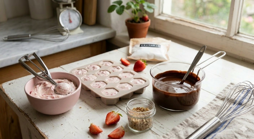 - Frucht-Faktor: Hebe die Erdbeerstückchen vorsichtig unter. Wenn du ein Püree nutzt, rühre es nur kurz ein, um einen schönen Marmor-Effekt zu erzielen.